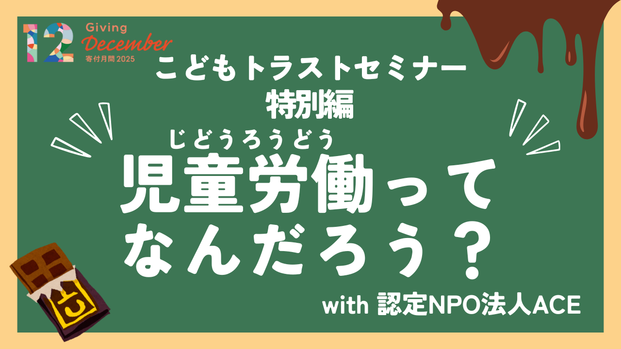 児童労働の撤廃と予防に取り組む国際協力NGO ACE(エース)による「こどもトラストセミナーを開催します。最初に、おかねの教室で「4つのお金の使い方(つかう・ためる・ふやす・きふする)」を学び、その後、「きふする」にフォーカスを当て、ACEさんによる「児童労働のない未来を」のワークショップで学びます。