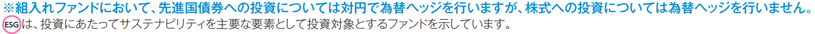 本ファンドの実質的な主要投資対象は外貨建資産であり、一般に為替変動リスクを伴います。本ファンドの株式部分については原則として為替ヘッジを行いませんので、為替変動の影響を直接的に受け、円高局面ではその資産価値を大きく減少させる可能性があります。本ファンドの債券部分については、投資対象ファンドにおいて為替ヘッジを行い為替変動リスクの低減を図りますが、投資対象資産および投資対象資産から生じる収益のすべてを完全にヘッジできるとは限りません。なお、為替ヘッジを行うにあたりヘッジ・コストがかかります(ヘッジ・コストとは、ヘッジ対象通貨の金利と円金利の差に相当し、円金利の方が低い場合この金利差分収益が低下します。)。